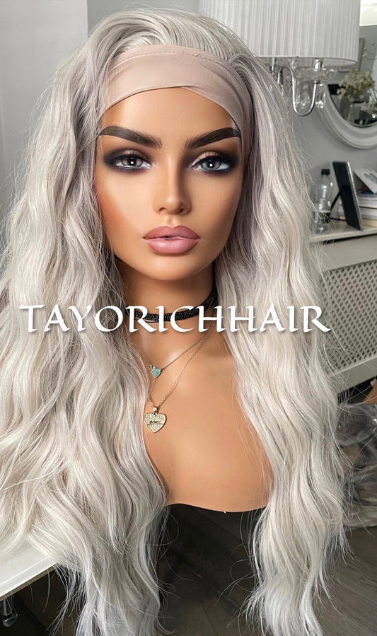 Ash Platinum Blonde Lace Front Wig With Dark Roots/ 13x4 Lace Front/ Heat Safe Sythetic Lush Wavy Lace Wig For Women/ Averrage Medium Cap SizeRegular price £130.00 GBPRegular priceUnit price / per-