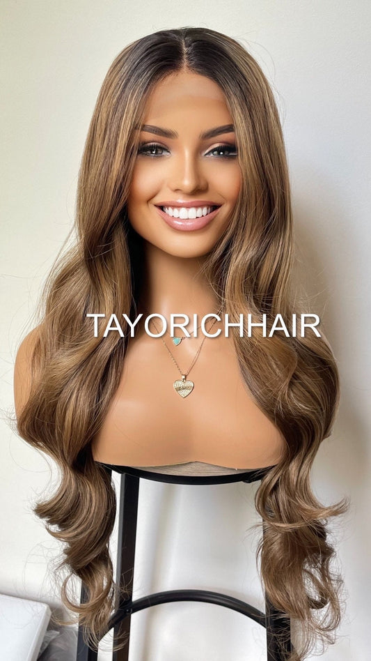 20 Inches Balayage Lace Front Wig/ 13x4 Wide Lace/ Black Roots Brown And Blonde Highlights/ Soft Narural Hair Synthetic Wig For WomenRegular price £125.00 GBPRegular priceUnit price / per-