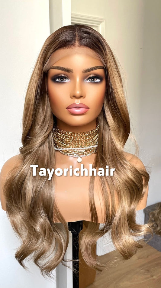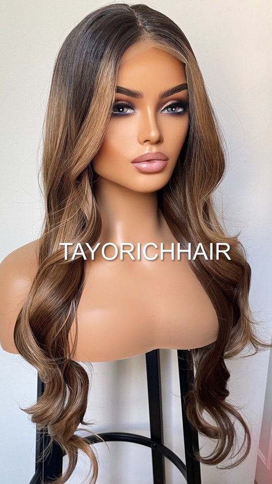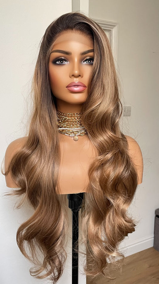 Caroline; Caramel Brown Lace Frontal Wig With Dark Roots & Lowlights