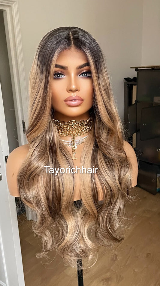 Mixed Sandy Caramel Honey Blonde Hair Wig With Black Roots- 20 Inches Blonde Heat Friendly Wavy hair Synthetic Wig By Tayorichhair