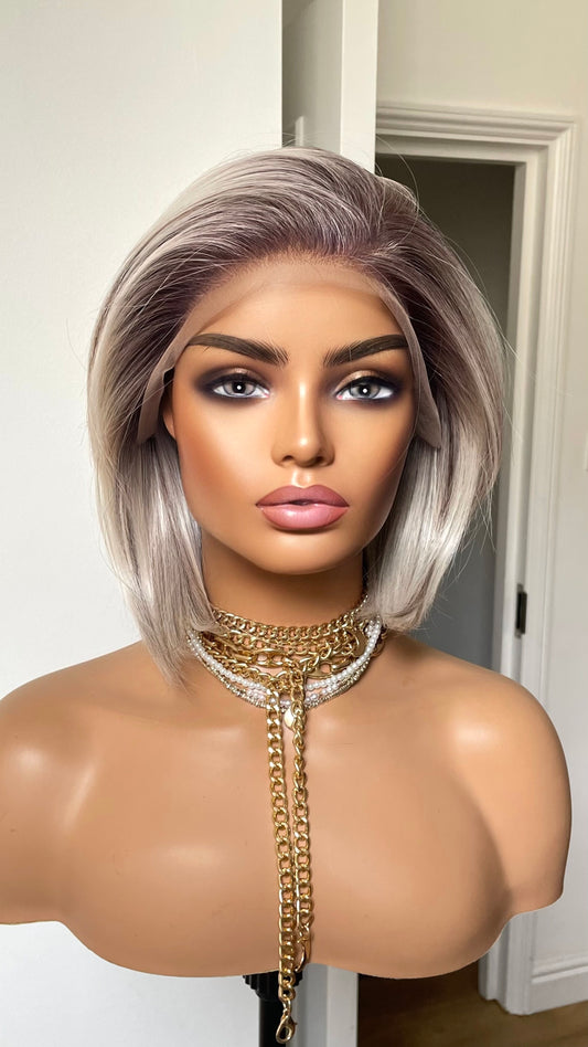 Salt and Pepper Short Bob Wig: Synthetic Lace Frontal, Brown Roots
