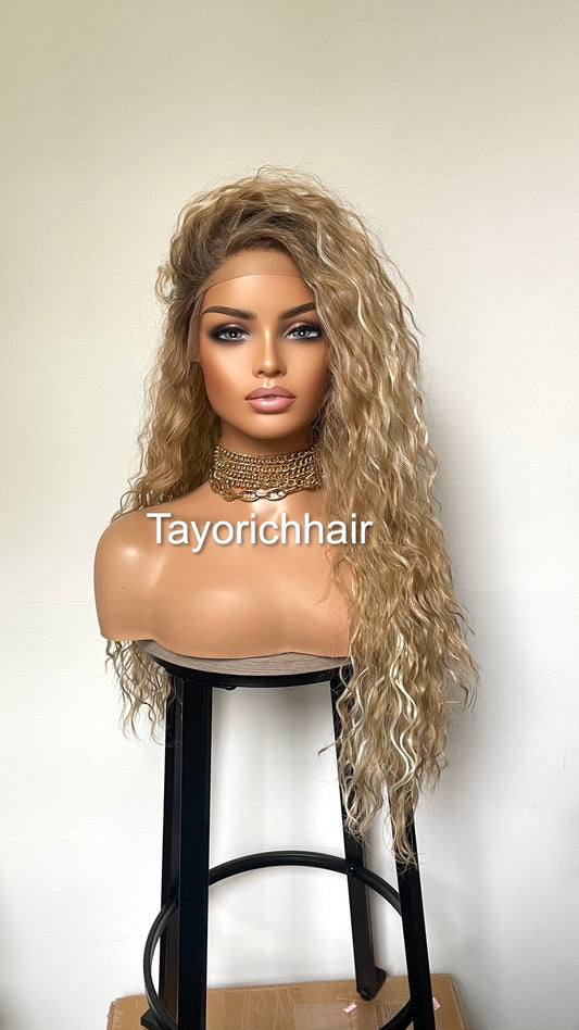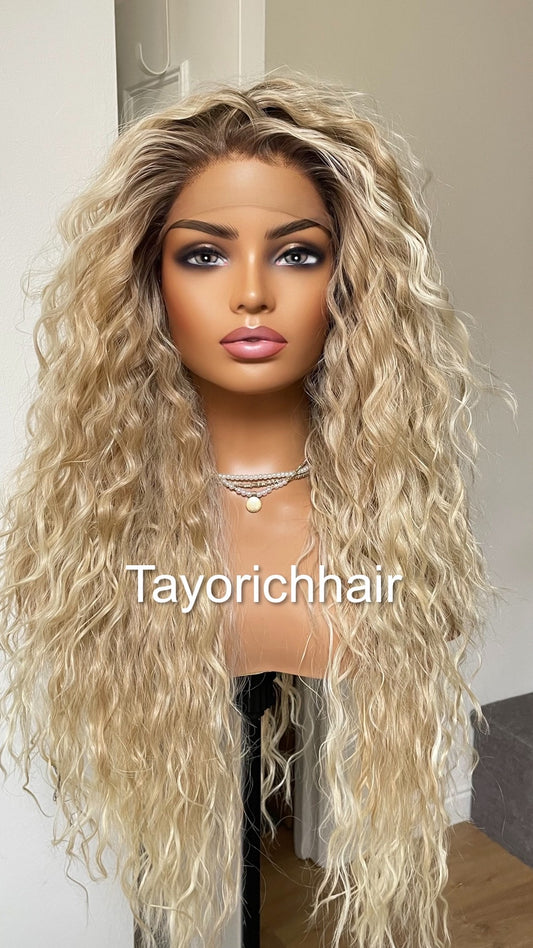 Mixed Blonde Curly Synthetic Lace Frontal Wig With Dark Roots/Lightweight Wig/Small Cap Size Long Curly Hair Wigs For Women By Tayorichhair
