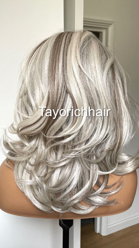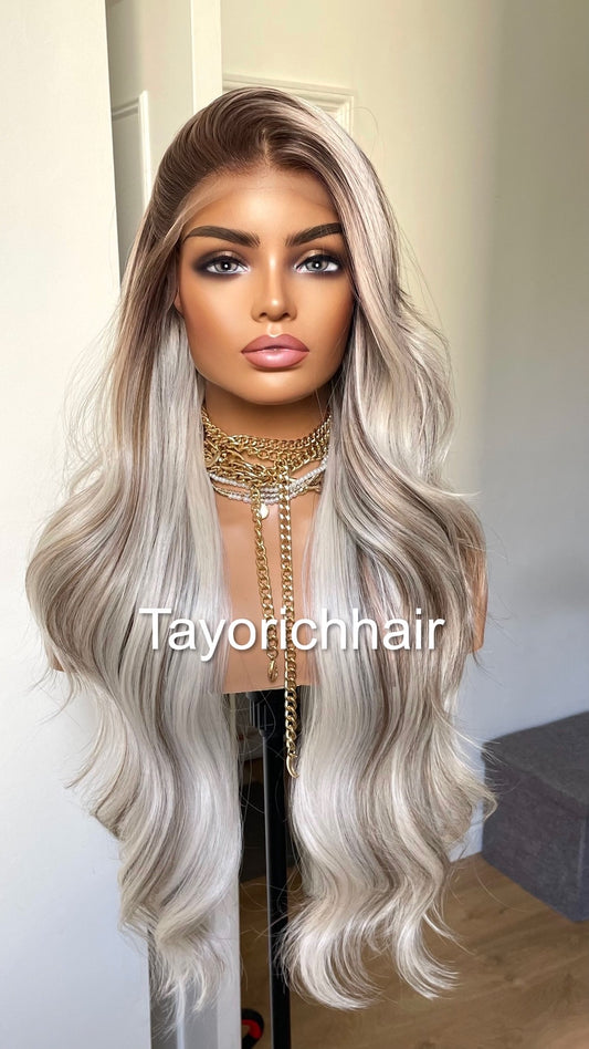 Platinum Blonde Lace Frontal Wig With Dark Ash Roots/Rooted Blonde Heat Friendly Synthetic Wig/ Blonde Bouncy Wavy Wig By Tayorichhair