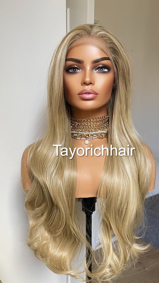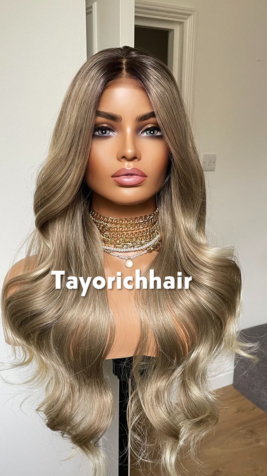 Dark Ash Blonde Synthetic Wig With Dark Roots/24 Inches Wavy Hair Lace Frontal Wig By Tayorichhair.