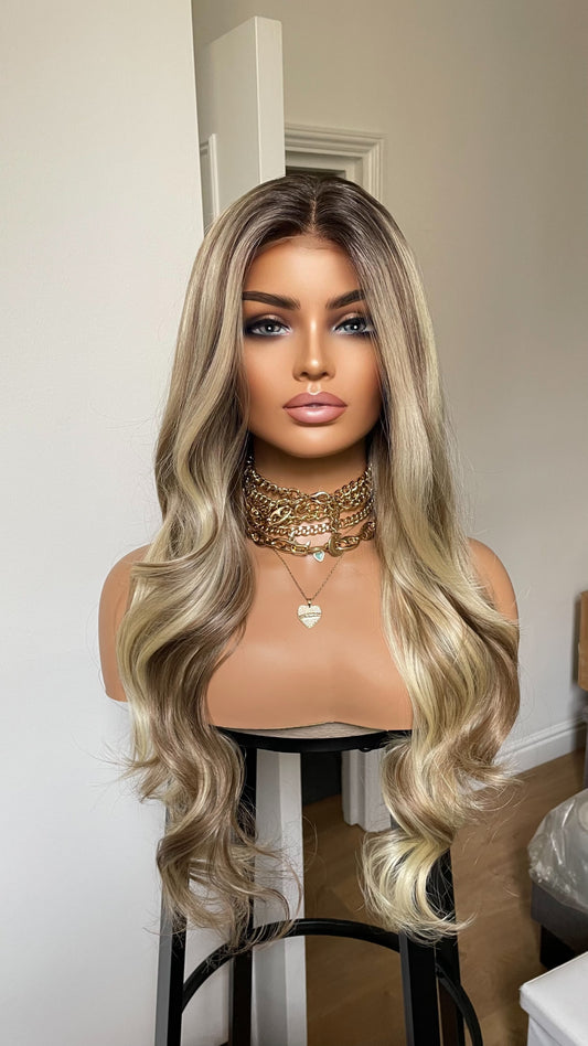 Sunkissed Dark Ash Blonde Hair With Light Blonde Money Piece And Short Black Roots|Wavy Hair Wig With Middle Part|13x4 Transparent Lace Top Wig