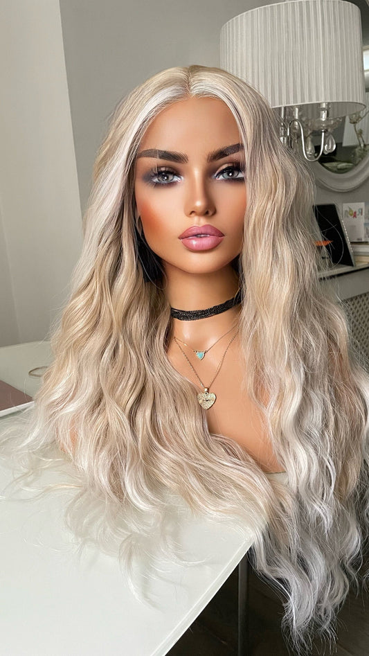 Ash Platinum Blonde Lace Front Wig With Dark Roots/ 13x4 Lace Front/ Heat Safe Sythetic Lush Wavy Lace Wig For Women/ Averrage Medium Cap Size
