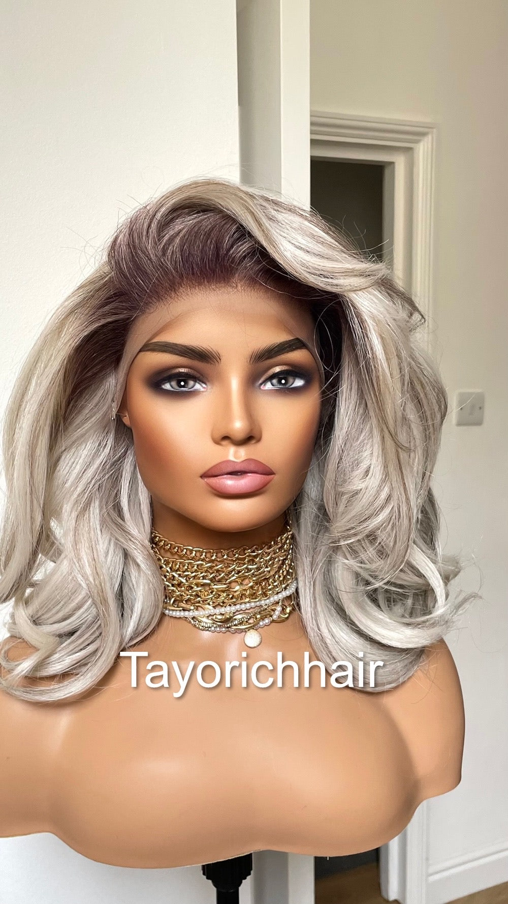 Bouncy Salt And Pepper Wig/ Wavy Hair Lace Frontal Wig/ Short Bouncy Grey Hair Wig With Dark Roots/ Wigs For Women Wavy Grey Hair Wig By Tayorichhair