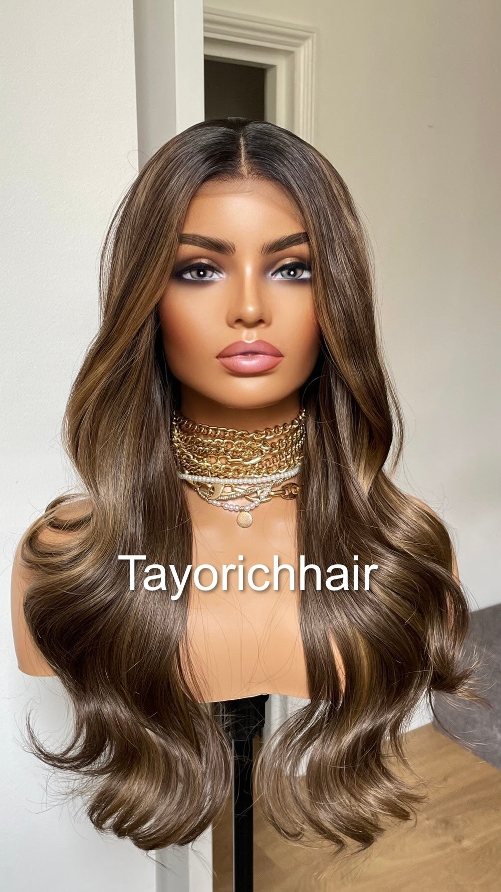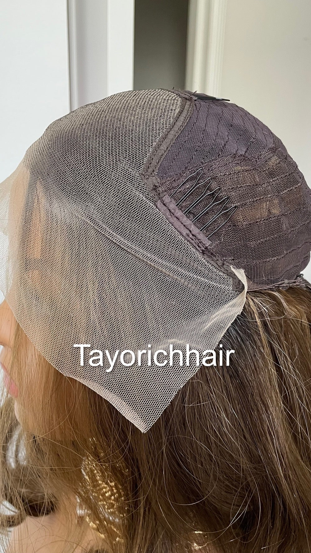 Darkest Brown Handtied Lace Top Wig With Dark Blonde Highlights And Black Roots-Wavy Hair In 20 Inches-Heat Friendly Wigs For Women