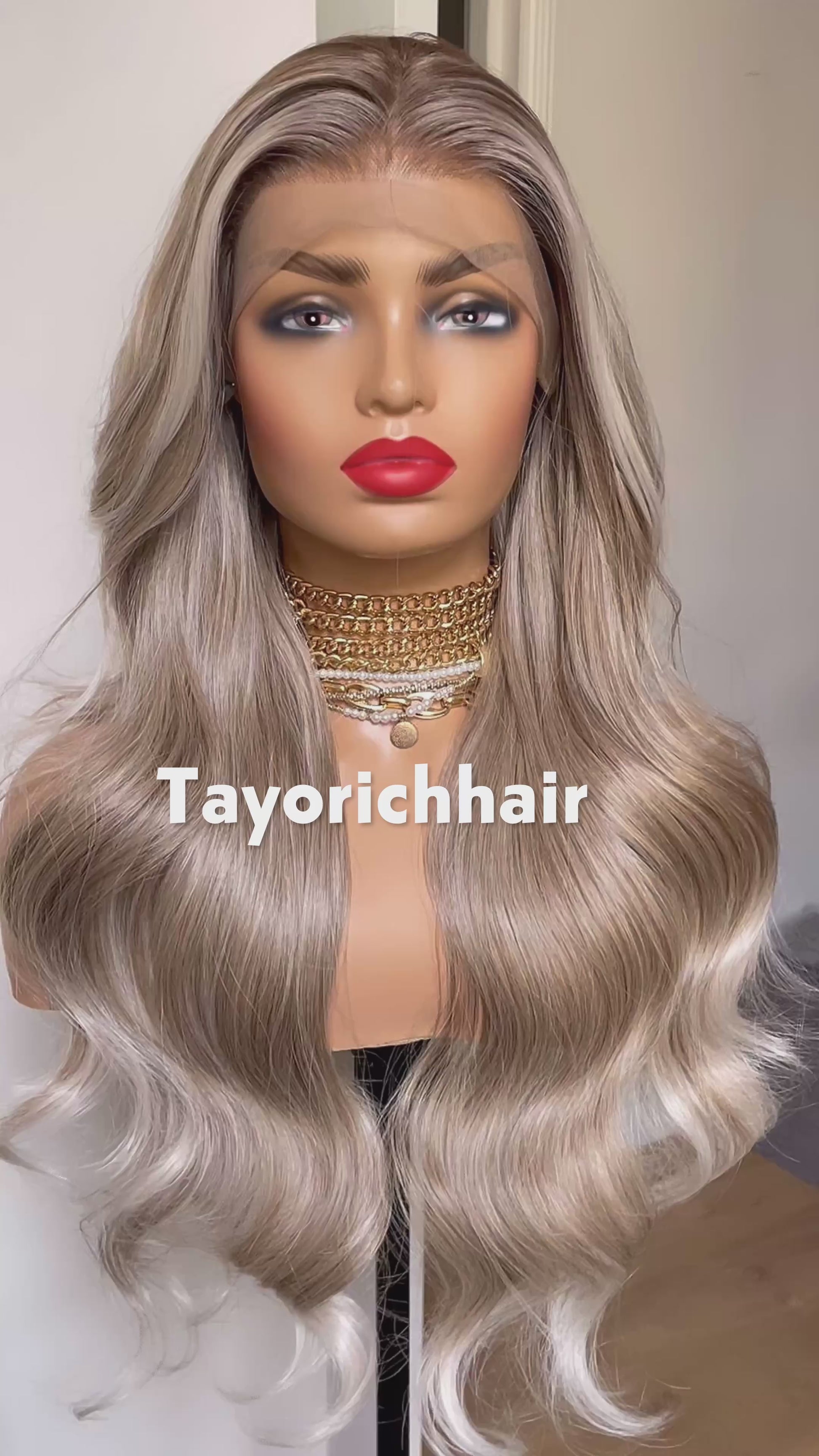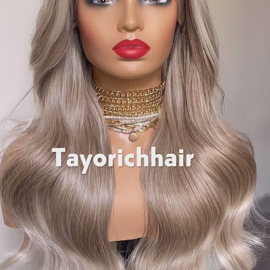 Dark Ash Synthetic Wig With Money Piece•Platinum Blonde Highlights• 24 Inches Bouncy Wavy Hair•Middle Part Realistic Wig•Ready To Ship Wigs