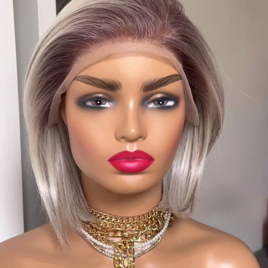 Salt and Pepper Short Bob Wig: Synthetic Lace Frontal, Brown Roots